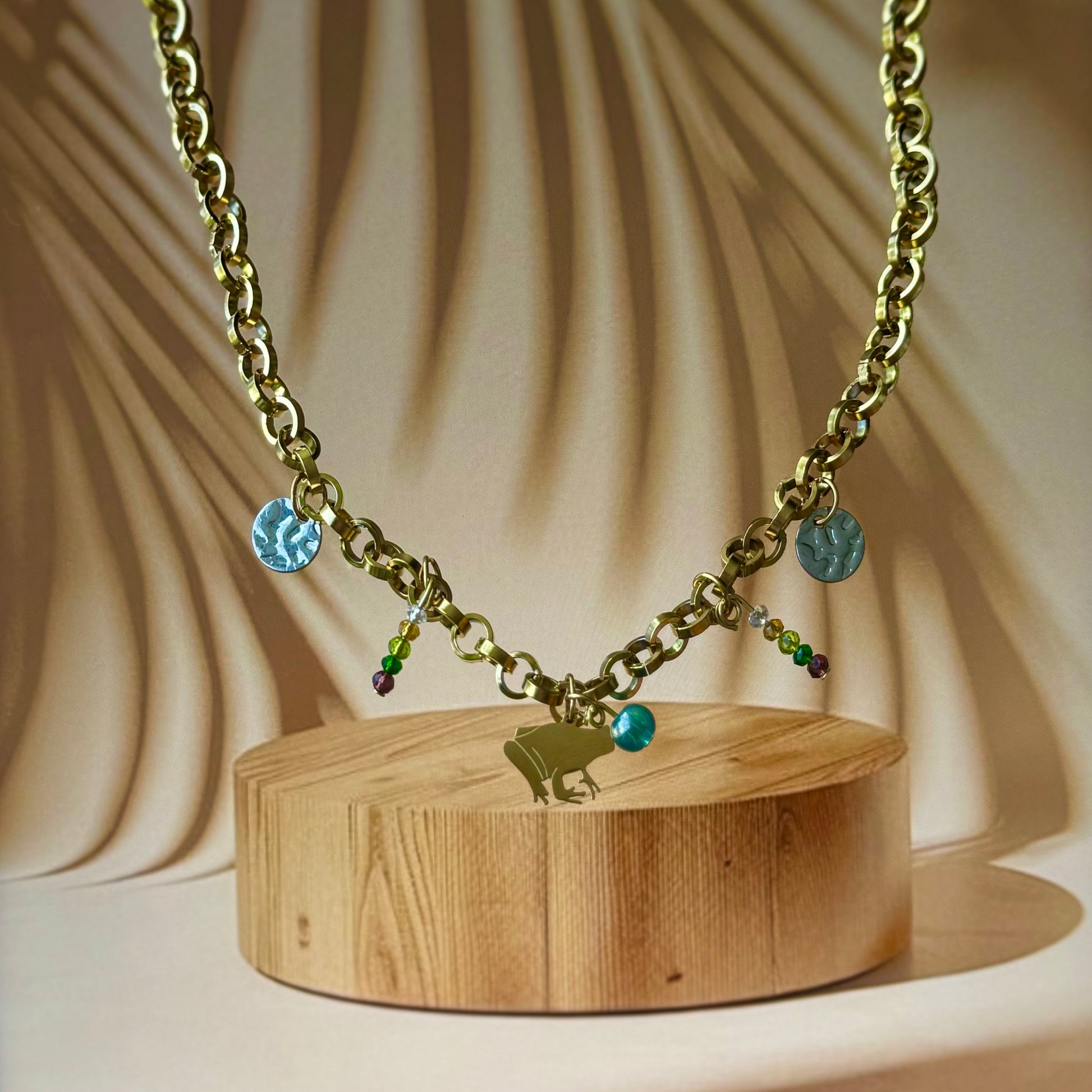 Inspirado en el Yunque al Este de Puerto Rico, este collar tiene un toque de tonalidades verde acompañadas por un coquí señalando la esencia del Yunque. Además, el azul claro que representa la playa y el color de la bandera original de Puerto Rico de “El Grito de Lares”.